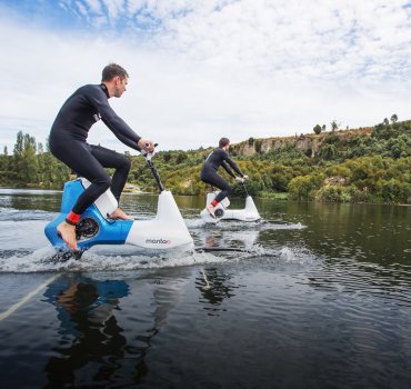 Jordan Engelsman (left) and Greg Johnston (right) test out the hydrofoil bikes on Lake Karapiro.