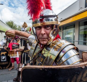 Roman soldiers, including club captain for Imperium-Romana Brett Clark, were out in force at the Cambridge Autumn Festival’s carnival and art market last SUnday, keeping traffic and pedestrians in line. Photo – Michael Jeans.