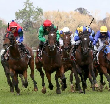 Rubira in action, with jockey in green sleeves and red cap. Photo – Trish Dunnell.