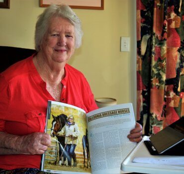Rachel Sloan, seen here with her trusty iPad and a magazine article on Balblair Farm, thinks she is probably the only person in the country monitoring the birth of dressage horses from almost 18,000 km away.