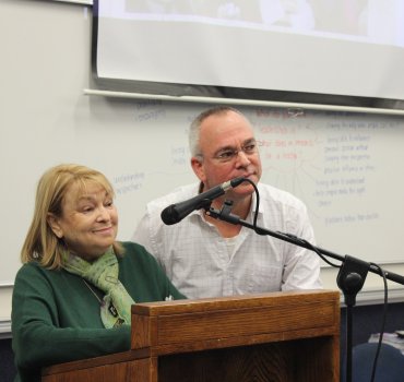 Vivienne Spiegel and son David Spiegel field questions from the St Peter’s crowd.