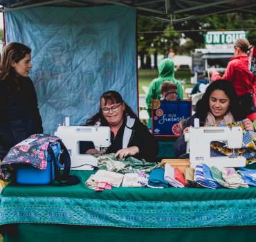 Whipping up some Boomerang Bags at the Farmers’ Market were Jenny Crawford (seated left) and Nu’umoe Duffy (right), with Helen Parker (standing). Photo – Lara Conners.