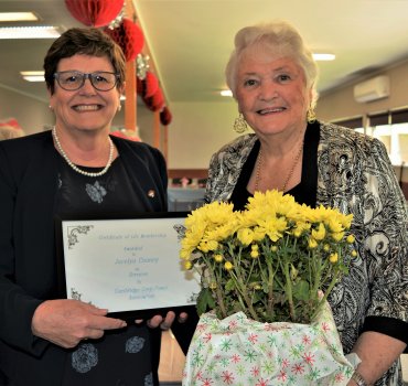 Val told the more than 40 members present that Jocelyn had been associated with Grey Power Cambridge since its inception 23 years ago, and she was delighted to present the life membership certificate in honour of her services to the organisation.