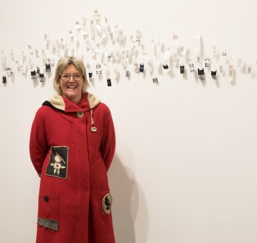Carrie Andrews with her work on exhibition at Waikato Museum.