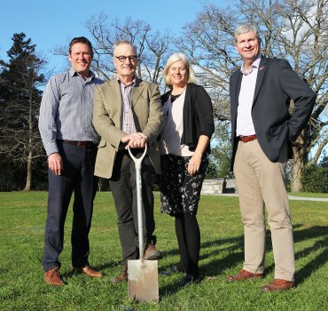 Cambridge Community Board chair Mike Pettit, Armistice in Cambridge chair Paul Watkins, Waipa District Councillor Liz Stolwyk and Brigadier Jon Broadley prepare to turn the first sod at the site of the Le Quesnoy memorial sculpture on Victoria St, where work is now underway.
