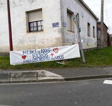 On the Rue Victorien Cantineu, just out of Cambridge’s “Sister City” Le Quesnoy, a recently pitched makeshift banner reads “Merci a Nos Heros. Aidez-les, restez chez vous.”