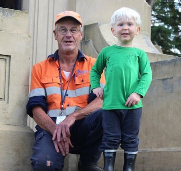 Lachlan Rusk (2) was delighted to meet Council parks and reserves team member and clock operator Jeff Masters.