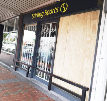 Boarded up again – Stirling Sports in Victoria St last Sunday after its seventh burglary in five years.