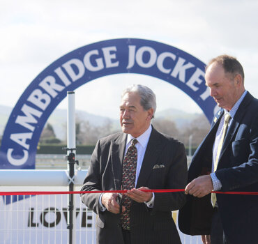 The former racing minister was invited to do the honours at the official opening of the Cambridge Jockey Club’s synthetic track – the first to be up and running in the country.