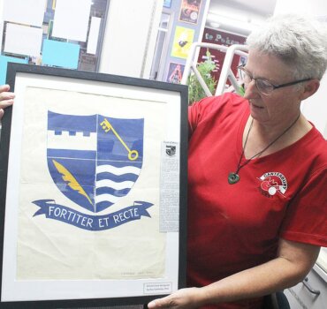 In the boxes were photos of cadets from the 1940s, school examination results, diaries, newspaper articles, school and Parent Teacher Association minutes and Kay’s original coat of arms folded into four and in the middle of a box.