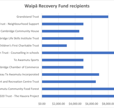 The other recovery fund recipients were the Ohaupō Community, Sport, and Recreation Centre, who received funding for Covid related expenses, the Grandstand Trust, also received funding for Covid related expenses, Te Awamutu Sports, got funding for an interactive community app, and the Cambridge Chamber of Commerce for a community-based ad campaign.
