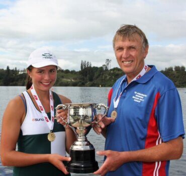 Hannah Osborne and coach Clive Steenson with the NZSSRC U17 Challenge Cup in 2011. Photo: Cathy Asplin
