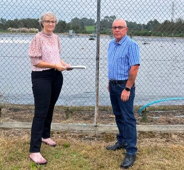 Dawn Inglis and council’s water services manager Martin Mould on site at the existing wastewater treatment plant in Cambridge. Photo: Supplied.