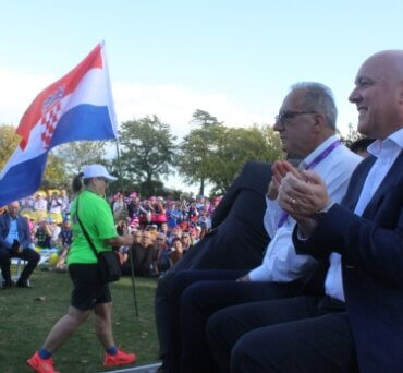 The Croatian flag bearer walks past as Chinese Ambassador Dr Wang Xiaolong talks to an aide behind him while next to Claudio Schermi, President of the European Dragon Boat Federation and Leader of the Opposition Christopher Luxon.