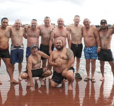 Tash Couzner, centre, with the first group to take the cold dip. Mid Winter Solstice Swim, Lake Karapiro