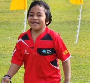 Peter Totoo was delighted to cross the finish line for Karāpiro School in the seven year olds boys’ race.