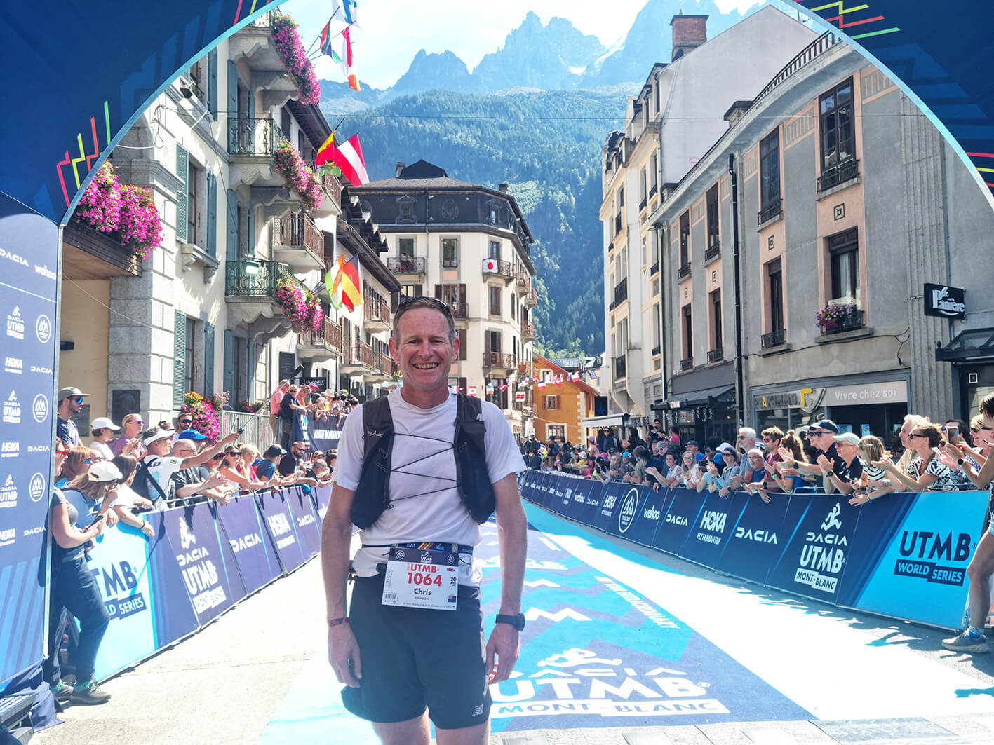 Chris Atkinson at the Chamonix finish line after completing a gruelling 172km run in 42 hours.