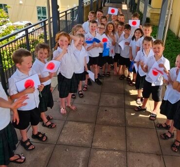 Cambridge Primary School students welcome the Bihoro delegation at the Cambridge Library. Photo: Mary Anne Gill.