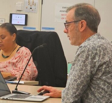 Te Kanohi’s Hinerangi Kara, centre, listens as Bryan Hudson presents his report at the Service Delivery committee. Photo: Mary Anne Gill.