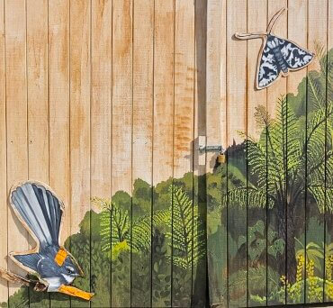 It depicts native flora and fauna with forms painted on thin plywood and affixed to painted wooden and brick walls. Pirongia artist Janie Neal was commissioned to complete the artwork.