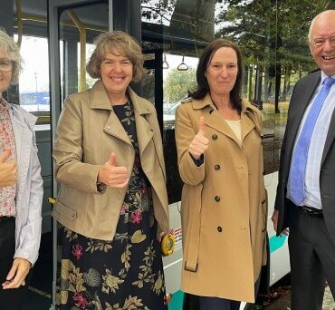 Thumbs up for the new EV bus launch. From left are Waipā District Council’s group manager service delivery, Dawn Inglis, Destination Cambridge general manager Ruth Crampton, Waikato Regional Council public transport manager Trudi Knight and Waipā District Councillor Roger Gordon. Photo: Viv Posselt