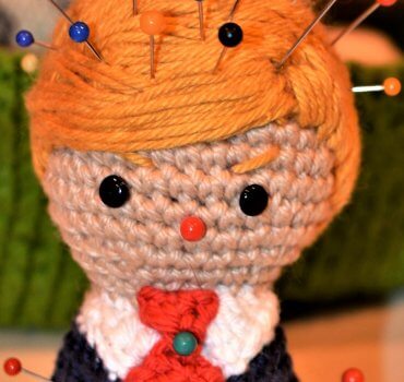 And then – sitting plum in the middle of their exhibition was a tiny pincushion, tellingly dubbed “The Don”. On the exhibition’s penultimate day, a member said the yellow-haired pincushion appeared to be attracting the sharp end of an increasing number of pins as the exhibition wore on.