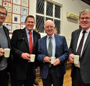 Pictured after the launch are, from left, NZ War Memorial Museum Trust founder Herb Farrant; Cambridge Community Board chairman Mike Pettit; Colin Averill, son of the man who in 1918 was first to scale the wall surrounding Le Quesnoy; and Waipa District Mayor Jim Mylchreest.