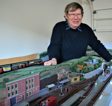 Paul with one of the miniature houses he makes as scene-setters for model railway layouts.