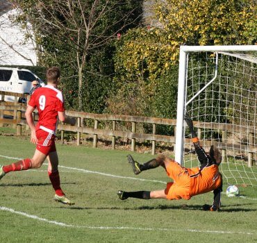 Cambridge striker Callum MacLeod shoots past the Melville goalkeeper to score. Photo – Louis Roberts.