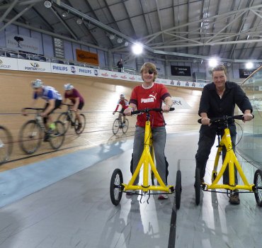 Eltje Malzbender, left, and Barbara Alink, inventor of the walking bike Alinker, at the Velodrome in Cambridge. Photo: Mary Anne Gill.