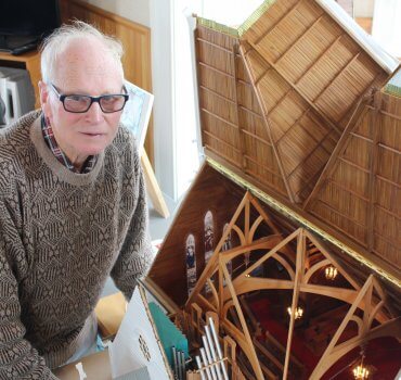 Roger Dean with his 1:24 replica of Cambridge’s iconic St Andrew’s church.