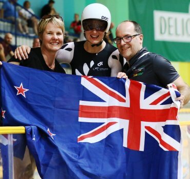 Ellesse Andrews celebrates her gold medal with her mother Angela and father Jon. Photo – UCI.