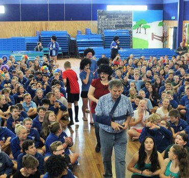 Students and staff alike wore curly wigs and moustaches to the assembly as a fun tribute to Mr Glover, whose moustache and dark curls have become a trademark over the years.