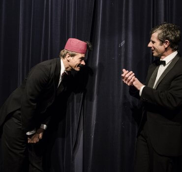 Dave Stearns and Phil Dalziel, Cambridge Repertory Society, pictured in front of the old curtains at the Gaslight Theatre.