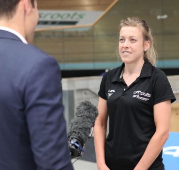Rushlee Buchanan speaking to a TV crew at the unveiling of Cycling New Zealand’s elite track squad.