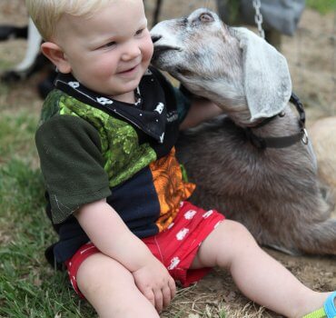 Rex Upton (16 months) from Whangarei was visiting the A&P Show with his mum. She said they were visiting friends in Cambridge over the weekend and saw the animals, so they stopped in because he loves animals. He did too, he was very interested in them and got right in amongst it patting the goats and feeding them grass and letting one lick his face.