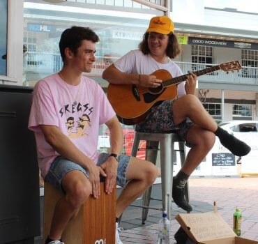 Heard the sound of drums in town recently? They may have sounded like bongos, but in fact it was a Cajón that could be heard throughout the CBD – a box-shaped percussion instrument originally from Peru, played by Felix Holton alongside bandmate Dylan Clark on the guitar.