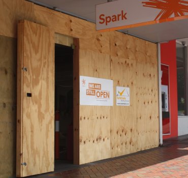 The Spark store is still boarded up, two and a half months on from the New Year’s Eve ram-raid that totalled its frontage.
