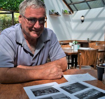 Murray Lopes, who helped build Cambridge swimming pool as a teenager, looking over copies of newspaper coverage of its construction, sourced from the Cambridge Library.