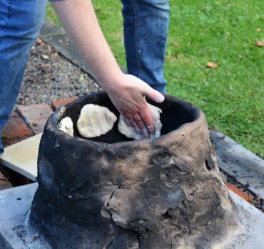 Tim fuelled his oven with wood and pine cones, saying the ancients would have used whatever was at hand, including animal dung. When the walls were hot enough he took pieces of both leavened and unleavened dough and deftly slapped them onto the upper sides of the oven – sometimes dodging the flames, sometimes not. Once browned, the bread patties were plucked off the oven walls and offered up to his audience, with everyone declaring the exercise a success.