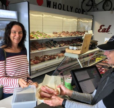 Sam Brydon (left) takes her containers to Wholly Cow, who weigh the meat on compostable paper and place it into her container.