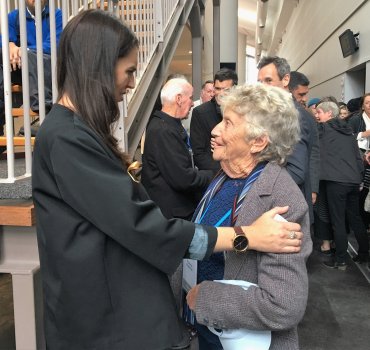 Cambridge’s Florence Shearman and Prime Minister Jacinda Ardern at the Wahine 50 commemorations on April 10.