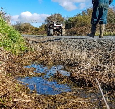The unnamed farmer in Te Miro shows a popular patch of Waterworks Road where effluent is often discharged, running straight into the roadside water table (pictured), into a nearby stream and then into the lake. “One guy even drove right along the road and it sprayed it straight into the water table,” he said. Photo – Michael Jeans.