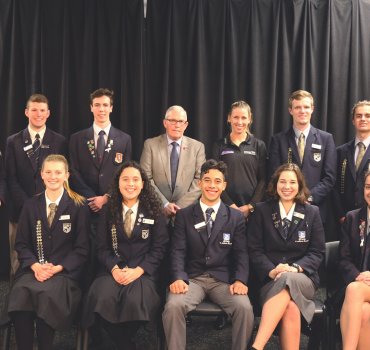 Deputy Mayor Grahame Webber with guest speaker Brooke Donoghue and head students of Waipā secondary schools. Back row: Leah Belfield, Dalton Hargreaves, Baxter Kane, Grahame Webber, Brooke Donoghue, Sam Hogan, Sam Scott, Georgie Edgecombe. Front: Amber Hope, Nu’umoe Duffy, Kaleb Roberts, Adriana Vasinca and Keruma Gibson.