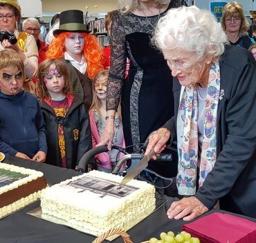 Faye Jeffries, one of the longest standing members of the Cambridge Library, cut the birthday cake. Photo – Michael Jeans.