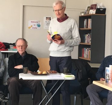 Dr Fred Simpson reading one of his poems, From the Old School, to the Cambridge Blind and Vision-impaired Support Group.