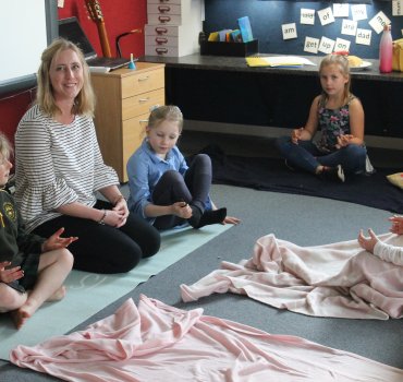 Photo: Students (from left) Macie, Isabelle, Lucie and Amelia getting themselves grounded at a mindfulness class run by Rachel McAllister.