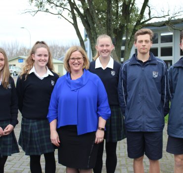 Hon. Louise Upston pictured with some of the students she met with at St Peter’s School, from left, Matt Wightman, Shobhit Kumar, Jonathan Khalil, Maddie Hodges-Jenkins and Bailee Lyall-Brennan.