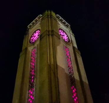 The Town Clock will be sporting a purple hue until September 25, in commemoration of the 125th anniversary of women’s suffrage in this country. Photo – Michael Jeans.