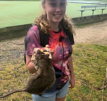 Bella Russell, 15, with the first rat caught in the newly-installed traps around Lake Te Kō Utu.